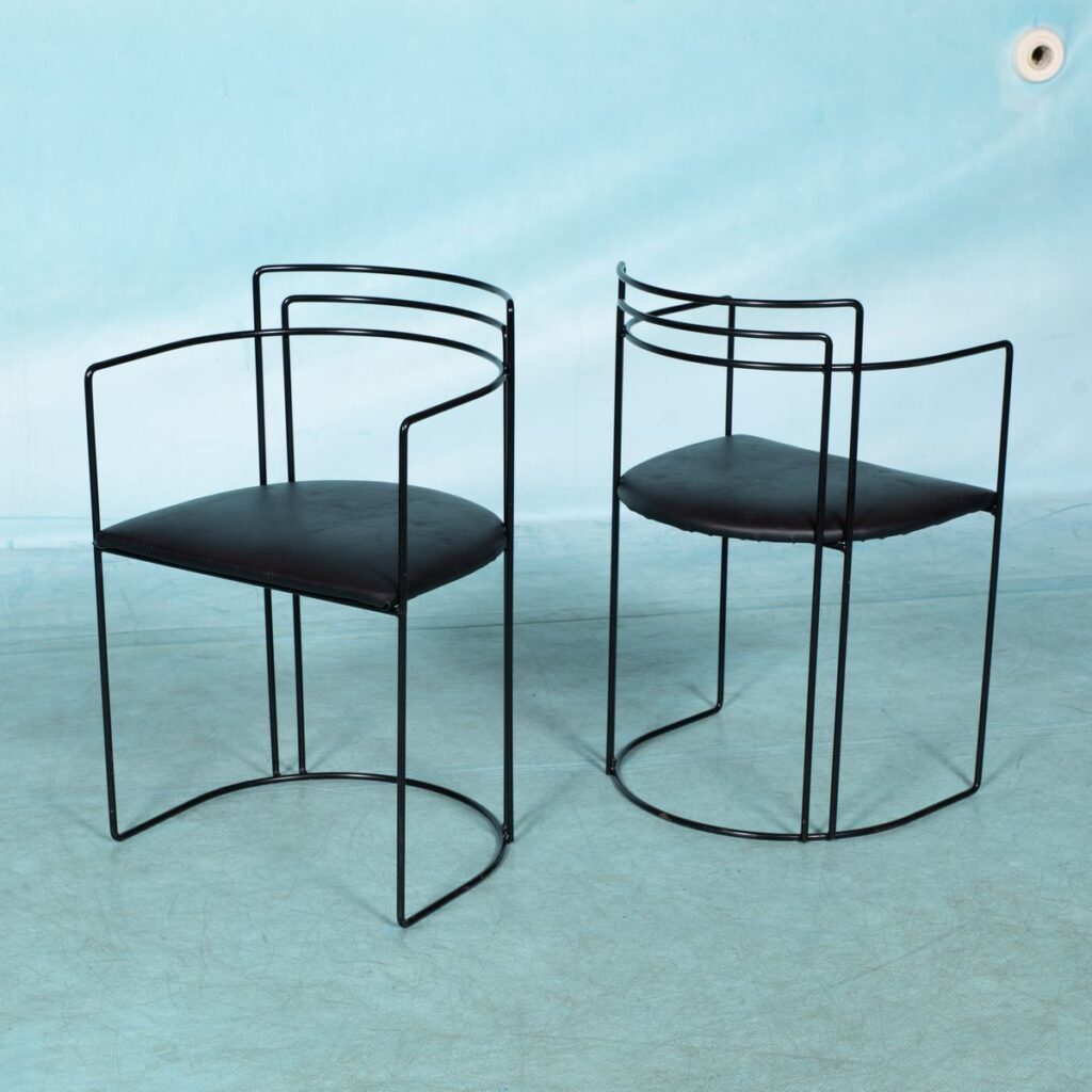 The chairs feature a minimalist, geometric frame made of thin, black steel wire. The design is airy and architectural, with a curved backrest and armrests. The seat is ergonomic and upholstered in black leather or a similar material.