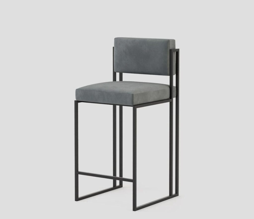 The Peter bar stool has a minimalist, contemporary design that combines comfort with a sturdy build. The clean, straight lines of the square metal frame give it an industrial look, which is softened by the plush, padded cushions on the seat and backrest.
